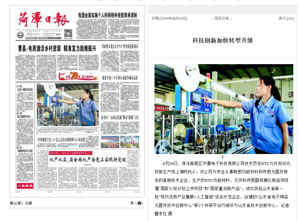 2019年8月29日《菏澤日報》報道:“科技創(chuàng)新加快轉(zhuǎn)型升級”。中廈電子科技有限...